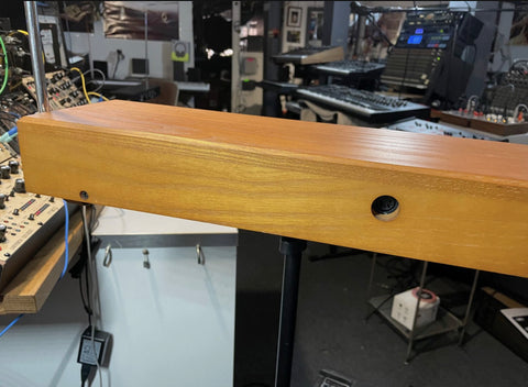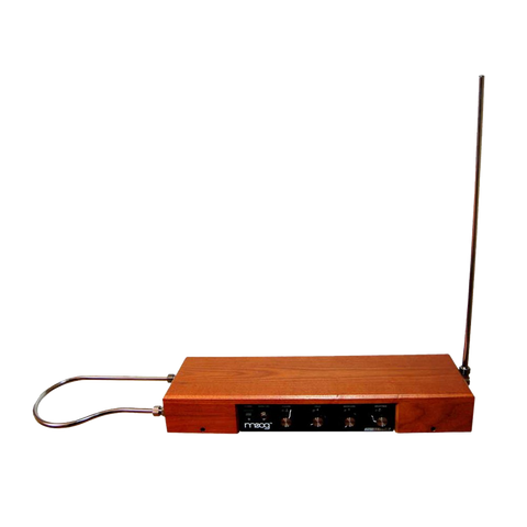 The Standard Etherwave theremin comes in a beautiful ash cabinet. The Etherwave is a quality musical instrument designed for ruggedness and portability. It has a five-octave pitch range and reliable spacing between notes for sophisticated playability. Antennas are nickel-plated 3/8" brass tube and cabinets are furniture-grade hardwood, finished with a custom Moog stain. The Etherwave is fitted with an adapter for mounting on a standard microphone stand and works best with Moog's TB-15 instrument amplifier.