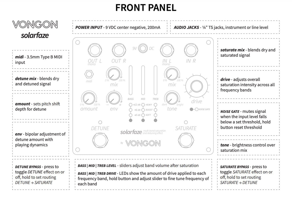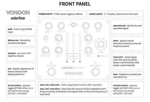 additional features include a built-in NOISE GATE for high-gain settings and flexible effect routing that allows SATURATE to run before DETUNE or vice versa. the pedal supports both analog buffered bypass for zero-latency pass-through and DSP bypass for completely silent effect toggling. MIDI control extends the possibilities further, with nine onboard user preset slots and remote adjustment of every parameter