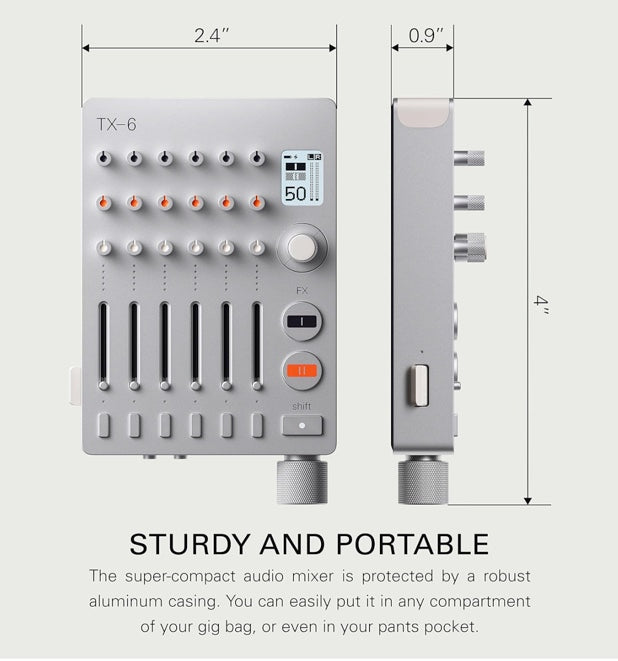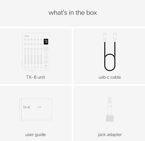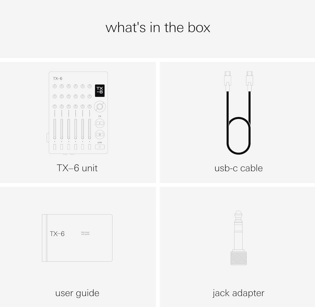 TX–6 is our powerful 6 channel stereo mixer with built-in equalizer, filters, compressor, aux send, cue and digital effects. this ultra-portable mixer can also be used as a multi-channel usb-c audio interface. constructed in anodized aluminum with pu leather backing. also included in the box: user guide, usb-c cable and 6.35 mm to 3.5 mm, mini jack adapter and reusable plastic storage box.