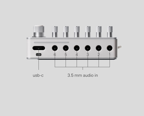 - versatile connectivity – use all 6 stereo channels, or make it 12 mono for Mac OS, currently only 2 channel for Windows. with teenage engineering high-quality custom cables, the narrow profile allows you to use all 6 channels at once and makes for an easy pack down. aux and cue outputs are available for monitoring, effect loops or headphones as well as 2 stereo outputs. connect your audio output through the 3.5 mm jack or use the included and removable 6.35 mm jack to 3.5 mm mini jack adapter.